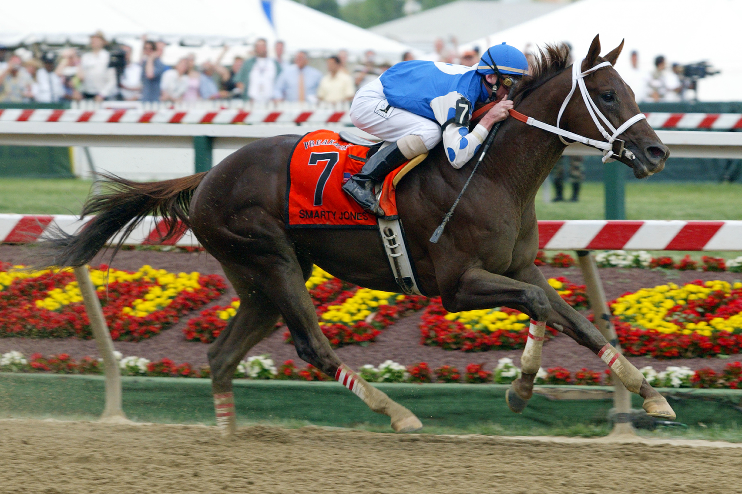 Bred in the Keystone State by Someday Farm, Smarty Jones (Elusive Quality—I’ll Get Along, by Smile) raced from 2003 through 2004, winning eight of his nine career starts, including the Kentucky Derby and Preakness Stakes in his sophomore season, and was voted the Eclipse Award for Champion 3-Year-Old Male in 2004. Campiagned by breeders Roy and Patricia Chapman under their Someday Farm banner, Smarty Jones was trained by John C. Servis and ridden exclusively by Stewart Elliott.