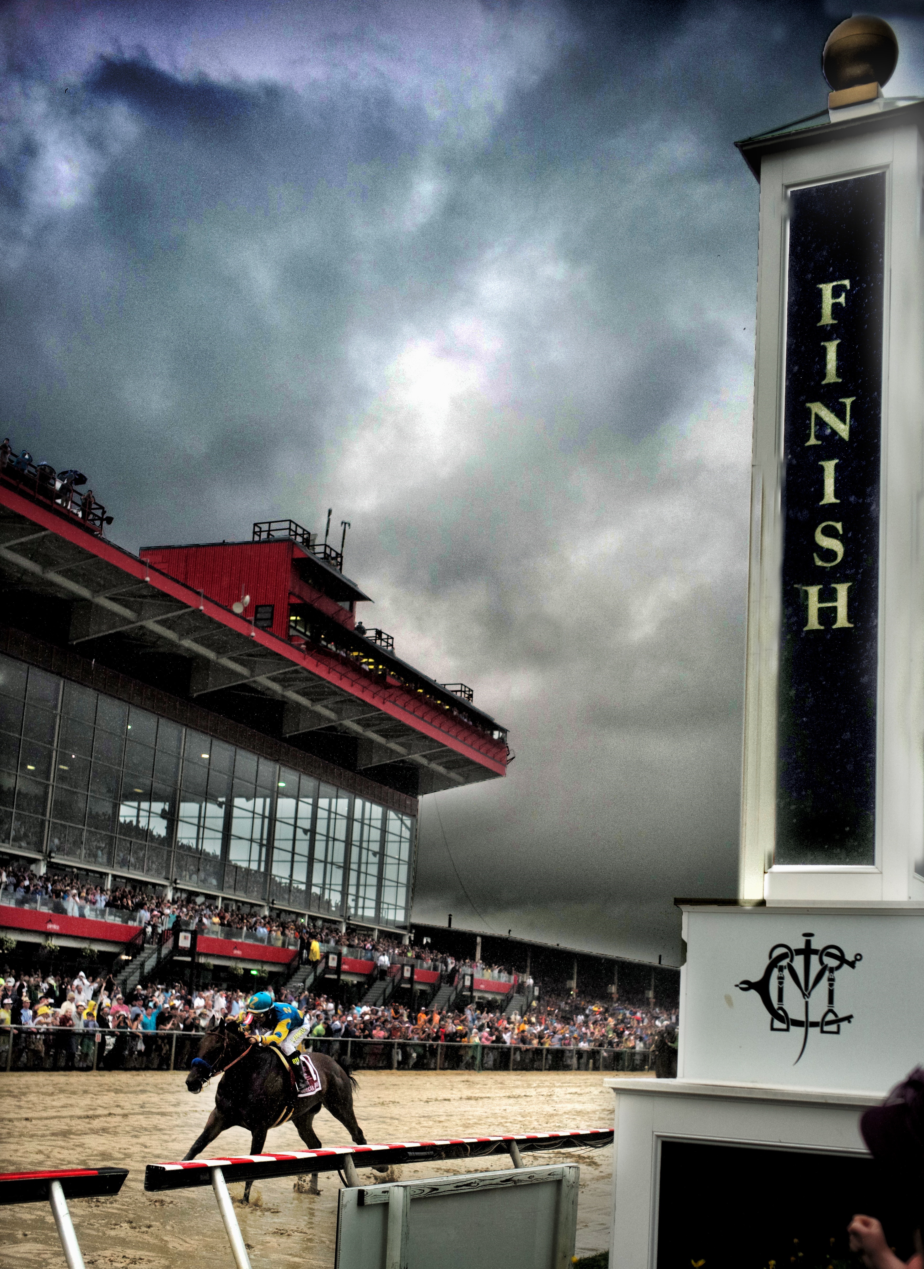 Two weeks later, on a stormy afternoon at Pimlico Race Course in Baltimore, American Pharoah went to the lead from the rail to set the pace. He turned back all serious threats by the far turn and increased his advantage in the stretch to win the 131st Preakness with ease by seven lengths before a record attendance of 131,680. Espinoza wanted to get to the lead quickly because of the sloppy track.