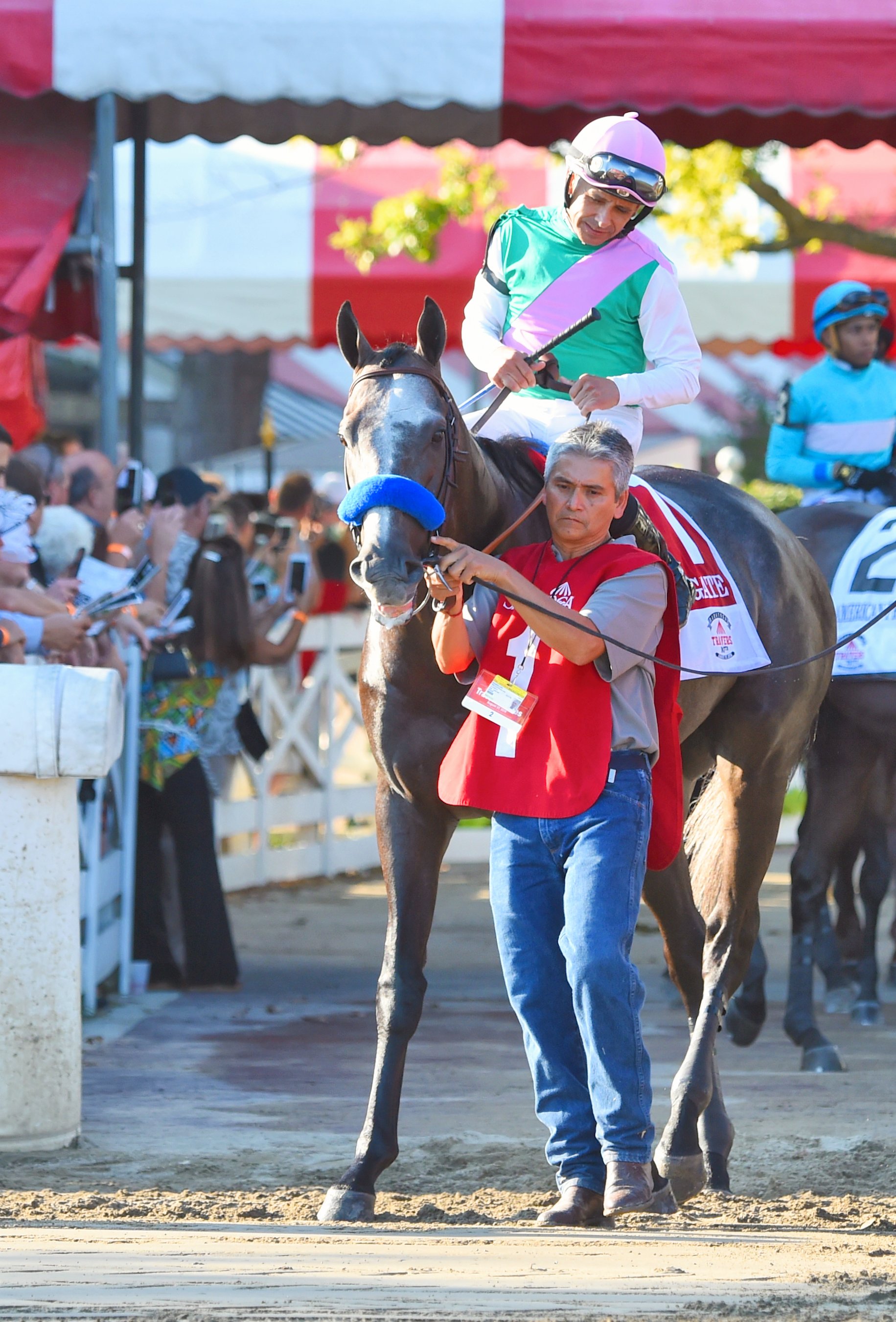 Bred in Kentucky by Clearsky Farms, Arrogate was out of the Distorted Humor multiple stakes-winning mare Bubbler. Purchased by Juddmonte for $560,000 at the 2014 Keeneland September Yearling Sale, Arrogate was sent to Southern California to begin his training with Hall of Famer Baffert. Unraced as a 2-year-old, Arrogate finished third in his career debut in April 2016 at Los Alamitos. He broke his maiden by 4½ lengths next out at Santa Anita then won allowance optional claimers at Santa Anita and Del Mar before making his stakes debut in the Travers.