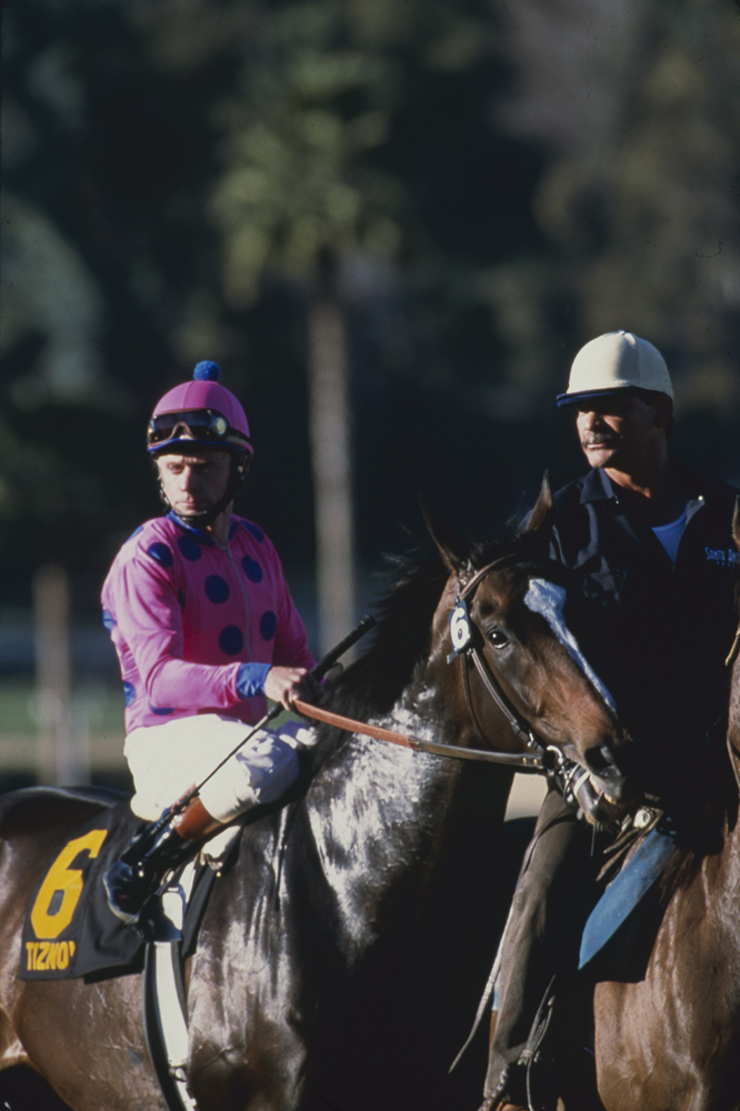 The 2001 Breeders’ Cup was held in October at Belmont Park, just 12 miles away from Ground Zero and under heavy security following the terrorist attacks of Sept. 11. The field for the Classic included European superstars Galileo, winner of the Epsom Derby and Irish Derby, and Sakhee, winner of the Prix de l’Arc de Triomphe, both trying dirt for the first time. The American contingent was led by Aptitude, winner of three straight races, including the Jockey Club Gold Cup. Tiznow was the fourth betting choice in a field of 13. He tracked the leaders down the backstretch and made his move on the turn where he swung five wide. Tiznow dueled with Albert the Great but could not get by, and then both were overtaken midstretch by Sakhee. McCarron then hit Tiznow once left-handed and the colt responded with a final lunge, winning by a nose over Sakhee with Albert the Great two lengths back in third. Track announcer Tom Durkin roared, “Tiznow wins it for America!”